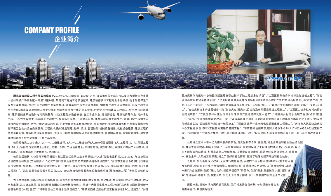 湖北亞合建設工程有限公司成立于2014年9月,注冊資金15000萬元,辦公地點位于武漢市江夏區(qū)大橋新區(qū)辦事處大橋村聯(lián)投廣場商業(yè)區(qū)一期第23幢16層,集建筑工程施工總承包貳級、建筑裝修裝飾工程專業(yè)承包貳級、防水防腐保溫工程專業(yè)承包貳級、市政公用工程施工總承包叁級、地基基礎工程專業(yè)承包叁級、鋼結構工程專業(yè)承包叁級、環(huán)保工程專業(yè)承包叁級、城市及道路照明工程專業(yè)承包叁級、施工勞務資質(zhì)等資質(zhì)為一體的施工企業(yè)。